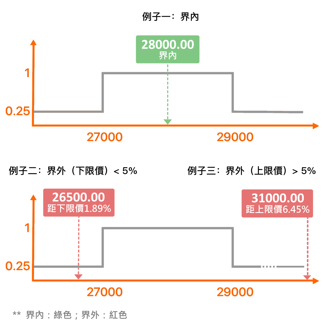 如上图所示,假设某恒生指数界内证上限价: 29,000点 及 下限价: 27,000点